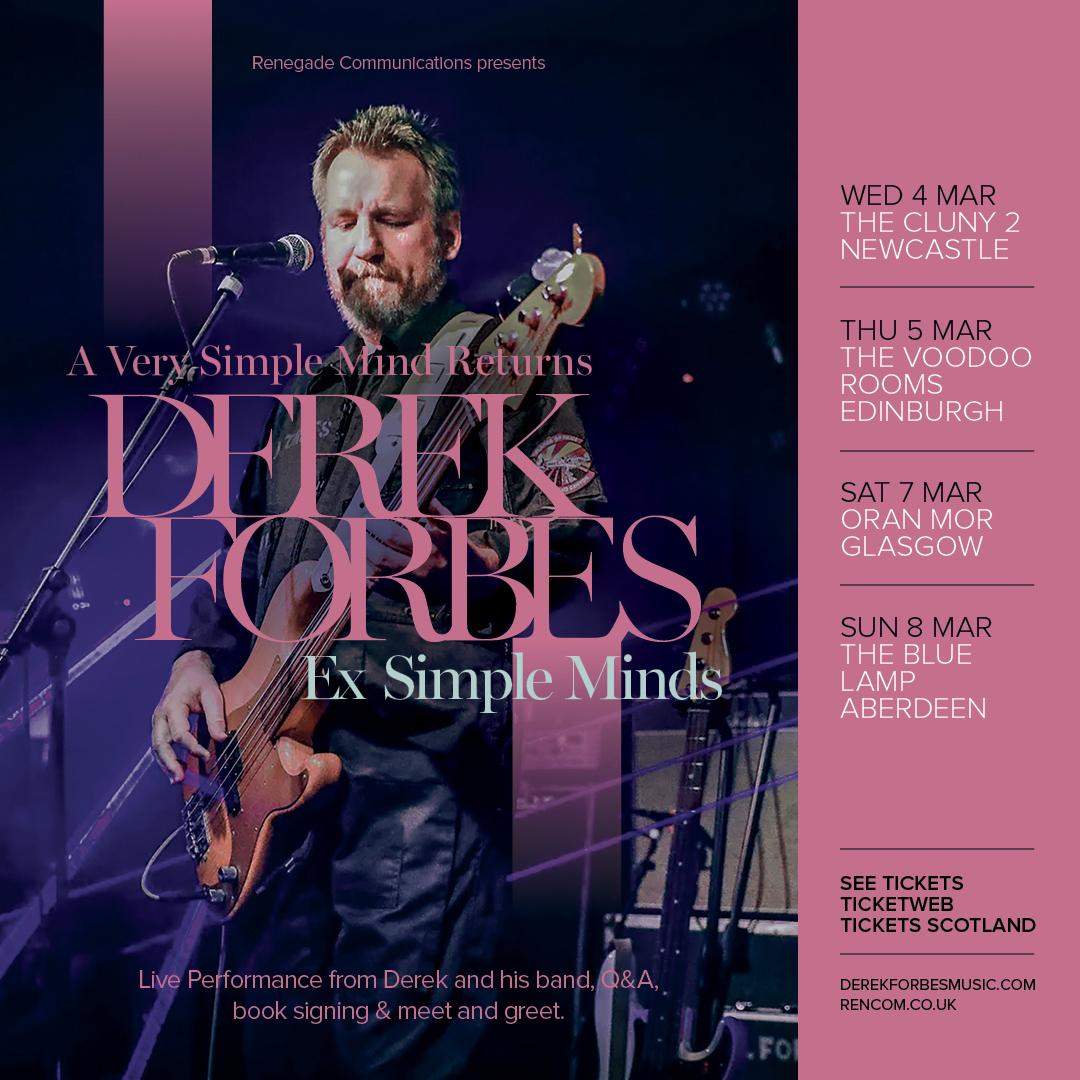 Following his successful UK mini tour in 2024 Derek Forbes, bass player with Simple Minds during that golden 1978 to 1985 period, returns with a full band in early 2026 to play a varied set which will include classics such as ‘The American’, ‘Love Song’, ‘Waterfront’, ‘I Travel’ & ‘Glittering Prize’. Whilst merch will be on sale there will also be a 30 minutes Q &am...